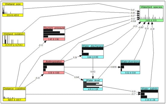 First, we built a conceptual model (Figure 2) of the alpha avian diversity (i.e., the mean number of avian species per wetland) in the study area on the basis of our previous studies [8,9,10]. The aim of this step was to provide a visual framework of how the drivers (e.g., salinity and mean water level) influence each other and the target variable (alpha avian diversity). The conceptual model was useful for mimicking the causal chains that determine the levels of alpha avian diversity in the studied wetlands.