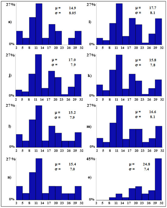 Baseline (a) and best-case (i–o) scenarios. The letters associated with the scenarios have the same meaning as per Table 2. On the x-axis, the expected distribution of the avian diversity (expressed as number of bird species in 10 equal-size intervals) is reported. On the y-axis, the proportion (in %) of wetlands that are expected to fall into each range of avian diversity is shown. For each scenario, the Greek letters indicate the mean (µ, i.e., alpha diversity) and standard deviation (σ) of the expected number of bird species per wetland.