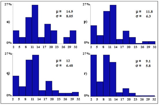 Baseline (a) and mixed (p–r) scenarios. The letters associated with the scenarios have the same meaning as per Table 2. On the x-axis, the expected distribution of the avian diversity (expressed as number of bird species in 10 equal-size intervals) is reported. On the y-axis, the proportion (in %) of wetlands that are expected to fall into each range of avian diversity is shown. For each scenario, the Greek letters indicate the mean (µ, i.e., alpha diversity) and standard deviation (σ) of the expected number of bird species per wetland.