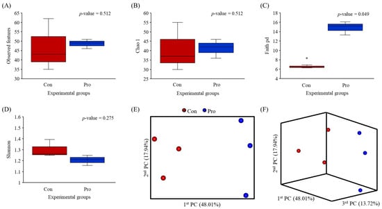 After 8 weeks of feeding with the Pro diet, the observed species richness (Chao1 index) and diversity (Shannon index) remained unchanged (p ≥ 0.05) relative to the control. However, phylogenetic diversity (PD) was significantly higher in the combined host-associated potential probiotic-supplemented fish intestine than in the control intestine (Figure 1C).