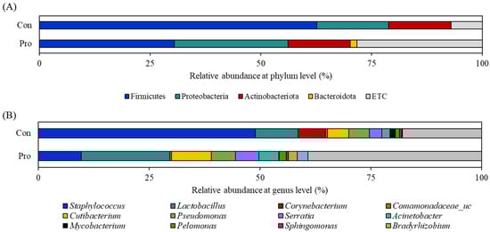 At the phylum level, Firmicutes was the most abundant in the intestine of the control flounder, followed by Proteobacteria and Actinobacteria (Figure 2A). However, the abundance of Firmicutes was significantly lower and the abundance of Proteobacteria was higher in the intestine of the Pro group than in the intestine of the control group.