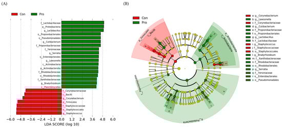 The LDA scores of Lactobacillaceae, Proteobacteria, and Lactobacillus were > 4.8 in the Pro group; by comparison, Firmicutes, Staphylococcaceae, Staphylococcales, and Staphylococcus scores were > −4.8, which indicated the difference in the abundance of microbiota at the taxon level (Figure 3A). The cladogram (Figure 3B) demonstrated significant variations; that is, Firmicutes and Bacilli were dominant in the intestine of the control group, whereas Actinobacteria, Actinobacteriota, Proteobacteria, and Planctomyetes were dominant in the Pro group.