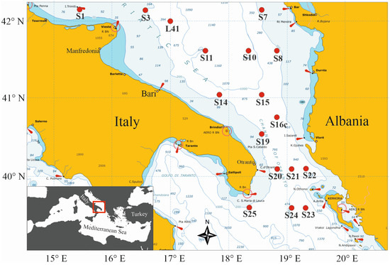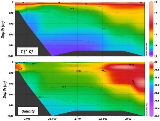 The oceanographic state during this cruise has already been described with reference to the θ-S diagram of the collected multiparametric probe profiles [30]. With reference to the section in the NW–SE direction within the area (Figure 2,) the analysis clearly shows the Levantine waters entering the Otranto Channel from south. These waters are characterized by higher salinity with an intruding core of S > 38.85 at around 400 m depth at the entrance. They directly influence the salinity in the upper mesopelagic and epipelagic layers by mixing with the ISW up to the southern Adriatic pit (St. S15) and, through the counterclockwise circulation of the ISW, also up to the outer northern part of the Italian shelf (St. S3).