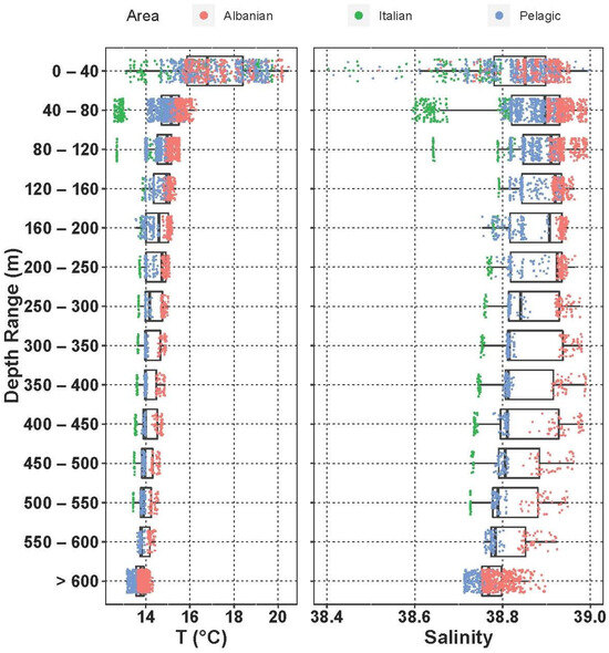 To better detail the presence of different water masses in the area, a section across the NW–SE direction in the middle of the region was defined (Sts. S3, L41, S11, S15, S21, S23). To highlight the spatial differences in the water column’s vertical structure in the region, the environmental measurements were pooled according to depth in the epipelagic and upper mesopelagic layers (five 40 m thick layers and eight 50 m thick layers, respectively) and considered as a unique group below 600 m. They were then categorized according to their geographic position in three classes: Italian side (Sts. S1, L41), Pelagic (Sts. S3, S10, S11, S14, S15, S19, S20, S25) and Albanian side (Sts. S7, S8, S16c, S21, S22, S23, S24).