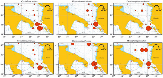 Abundance representation, expressed as ind. m−2, of the six most abundant species of fish larvae in the south Adriatic Sea. Values for each station come from the integration of all the sampled water column abundances expressed on a 1 m2 basis. Note differences in abundance scale.