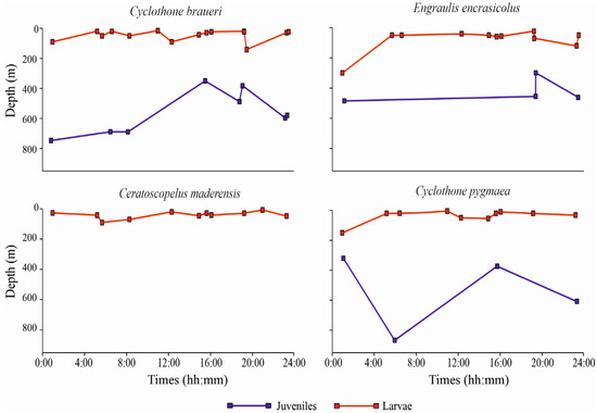 In addition, E. encrasicolus did not show variation in depth occurrence between day- and nighttime. The WMD of larvae ranged between 23 m and 121 m, with one deeper WMD of 300 m (St. S21). Juvenile developmental stages showed deeper WMD of from 300 m to 486 m. C. maderensis larvae, similarly to the larvae of other species, showed more superficial distribution relative to juveniles. Larval WMD ranged between 7 m and 90 m. C. maderensis larvae did not show DVM. Juvenile WMD are not shown in Figure 5, because only three specimens were found in St. S22, in the layer 400–600 m. C. pygmaea as larvae showed WMD of between 5 m and 54 m, with one deeper value of 150 m (St. S10). Juveniles of this species showed deeper WMD, from 300 to 850 m, and without differences between day- and nighttime, similar to the other three species.