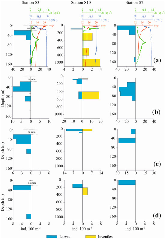 Profiles of the vertical distributions for the four most abundant species are shown in Figure 6 and Figure 7, separately for larvae and juvenile specimens, together with chlorophyll, temperature and salinity values. Three pelagic stations in the Otranto Channel (S20, S24, S22), a coastal station near Italy (S3), a coastal station near Albania (S7) and a pelagic central station (S10) were the stations selected.