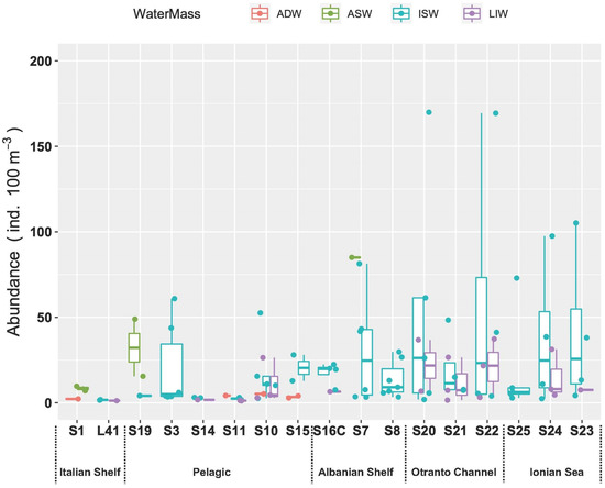 The analysis of the spatial distribution of fish larvae abundances suggests that differences between water masses were not significant (ANOVA, p > 0.05), while a weak significance could be observed between stations when grouped by region according to the geographical proximity to the Italian or Albanian sides (ANOVA, p = 0.07) (Figure 8).
