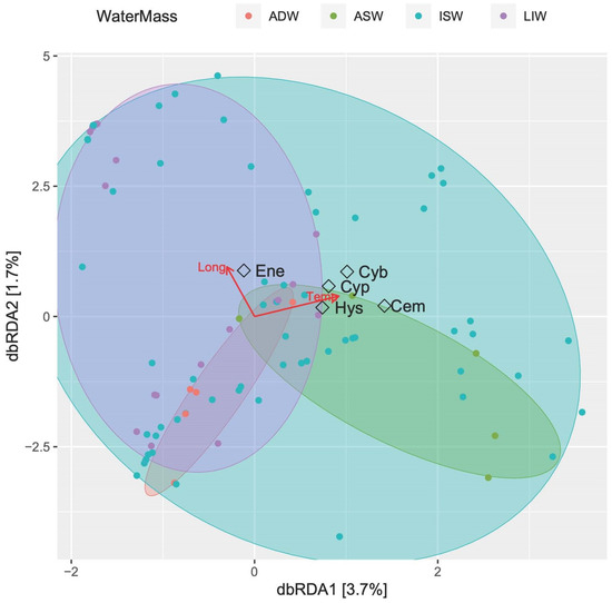 Constrained classifications by distance-based redundancy analysis (db-RDA) ordination diagram of fish larvae species in southern Adriatic Sea. Red arrows indicate significant explanatory variables (longitude and temperature). The samples are labelled according to their water-mass cluster membership. The five most abundant species are shown (Cyb: C. braueri, Cyp: C. pygmaea, Cem: C. maderensis; Hys: Hygophum sp.; Ene: E. encrasicolus).
