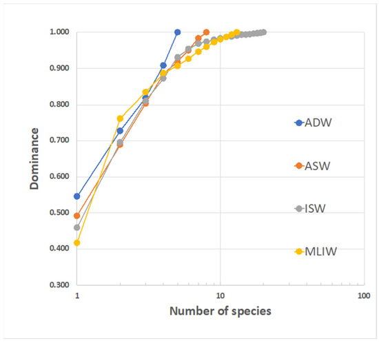 To compare the diversity in the four water masses, the reciprocal position of the k-dominance curves can be examined (Figure 11). Though they each exhibit a quite different overall species richness, the four curves strictly track each other for the first (3–4) ranked species, and then the more speciose ISW exhibits the flattest slope (beyond the 8th rank). This is related to good levels of completeness for the samples describing this water and could also depend on the relevant import of species from a larger metacommunity, driven by the mixing with MLIW.