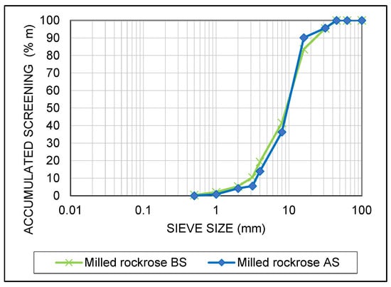 Biomass storage contributed to improving some biofuel quality parameters, with the reduction in ash content and trace elements being the most notable aspects (Table 5). In the case of 30 mm milled material, the ash content reduction after storage (≤3%), together with the decrease in Ni content (from 18.0 to 5.0 mg kg−1 d.b., below I1 class limit ≤ 10 mg kg−1 d.b.), allowed for the classification of this biofuel as class I1, according to ISO 17225-9:2022, dedicated to the specification of graded hog fuel and wood chips for industrial use (Table 7). The rest of the parameters were widely fulfilled. It should be noted that the stored biomass was shredded with new blades in the pre-shredder rotor, which were less alloyed in Cr and Ni than the previous ones. Therefore, the higher content of these elements in the just-harvested biomass could be due to the contamination caused by the blades’ wear. On the other hand, the fraction of fine particles of milled rockrose (graded hog fuel) was particularly high (10.5% < 3.5 mm) (Table 6 and Figure 1) and a prior screening process before its use would be advisable to reduce fine particles.