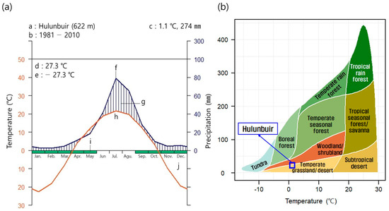 Diagram of climate from 1981 to 2010 (a) and biome classification according to Whittaker (1962) (b) in Hulunbuir. a: location name and altitude, b: the period of observation, c: mean temperature and annual mean precipitation, d: maximum temperature of warmest month, e: minimum temperature of coldest month, f: mean monthly temperature, g: humid period, h: mean monthly precipitation, i: a month in which the average daily minimum temperature is 0 °C or lower, j: the dry season in the left figure (a). In the right figure (b), the blue square means the corresponding biome in Hulunbuir.