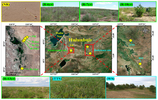 The four photographs at the top are landscapes (from right to left) of restored sites (R-6yr, R-7yr, R-10yr) including the unrestored site (NR). In the center photographs, the one on the left shows the location of the unrestored site and the restoration point, the one in the center shows the location of all research stations in the Hulunbuir area, and the one on the right shows the location of the reference ecosystem. From the right to the left at the bottom, the photographs show the restored area (R-10yr), temperate typical steppe (TTS), and woodland steppe (WS). The red boxes indicate the location of the research sites, and the dotted line is the direction for the enlarged photograph of the location of the research site. Abbreviation explanation: R-(number/yr) the number of years elapsed since restoration, TTS means temperate typical steppe, WS means woodland steppe, and NR means non-restoration.