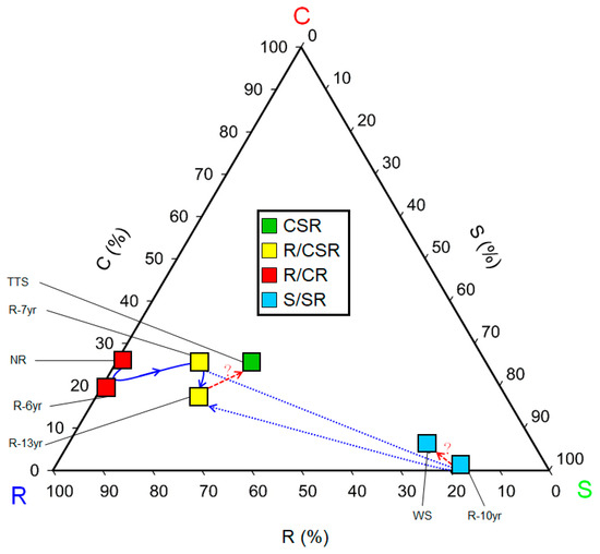 Trinomial plot showing the relative percentages of C, S, and R selection for communities at the study site in Hulunbuir. The boxes in the triangle diagram are arranged in relative proportions of each institute’s community CSR ecological strategy, and the color represents the community CSR ecological strategy, as shown in the legend at the top. The solid blue arrows indicate the direction from dry land to restored land and reference ecosystems. The arrows on the blue dotted line indicate the projections of transitions in the order of restoration elapsed time. The red dotted line and question marks represent subliminal predictions moving forward to the reference ecosystem. The scales of the axes of the triangular degree indicate the coincident grid lines inside the triangle. The classification of C-S-R types in trigonometry is indicated by the color’s red (C selection), green (S selection), and blue (R selection). Abbreviation explanation: R-(number/yr) means the number of years elapsed since restoration, TTS means temperate typical steppe, WS means forest steppe, and NR means non-restoration.