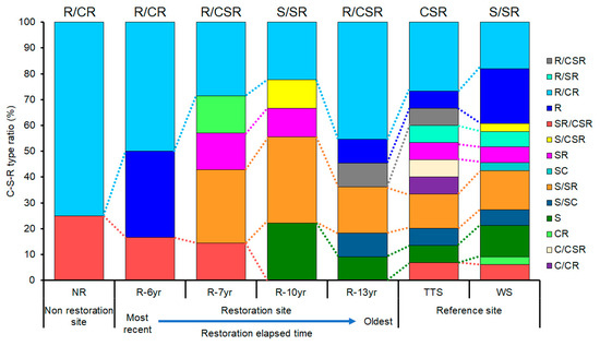 Among the total of 14 types of C-S-R ecological strategies of plants by study site, the S-selective type and R-selective type were in all study sites, whereas the C-selective type appeared only at the TTS (Figure 5). The numbers of types of ecology strategies of plants that appeared by research site and the types that occupied the most were two and R/CR (75.0%) at NR, three and R/CR (50%) at R-6yr, five and R/CR and S/SR (28.6% each) at R-7yr, five and S/SR (33.3%) at R-10yr, S/SR (33.3%), and six and R/CR (45.4%) at R-13yr (Figure 5). In addition, in TTS and WS, there were 11 types of CSR ecological strategies, and the most common types were R/CR (29.4%) and S (25.7%), respectively. In NR and R-6yr, two to three types appeared, which were significantly less compared to the restored sites and reference ecosystems, and the longer the elapsed restoration time and in the reference ecosystem, the greater the number of types of CSR ecological strategies of the species that appeared (Figure 5).