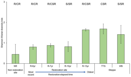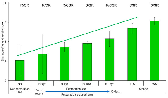 Comparison of Shannon–Wiener diversity of community CSR ecological strategy by research site in Hulunbuir. Error bars represent the standard deviation. The bars indicate the Shannon–Wiener diversity of the composition ratio of community CSR per study site. The blue dotted line above the bars of the unrestored and restored areas means the regression line (R2 = 98.5%). Abbreviation explanation: R-(number/yr) means the number of years elapsed since restoration, TTS means temperate typical steppe, WS means woodland steppe, and NR means non-restoration.