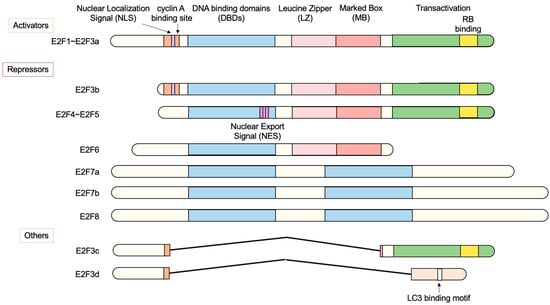 Analysis of the molecular mechanism of induction of adenovirus E2 gene expression by adenovirus E1a identified a cellular transcription factor termed E2 transcription factor (E2F) []. Later studies showed that E2F activates a variety of growth-associated genes, thereby playing a central role in cell proliferation [,]. In addition, E2F also plays crucial roles in other important biological processes such as apoptosis, tumor suppression, development, differentiation, cellular metabolism, angiogenesis, metastasis, stemness, and others [,,,,,,,,,,,,,,]. E2F is composed of eight family members (E2F1–E2F8), which regulate these biological processes. According to their primary function, E2F1–E2F3a are regarded as transcriptional activators and E2F3b–E2F8 are regarded as transcriptional repressors (Figure 1). Expression of E2F1–E2F3a is induced at the G1/S boundary of the cell cycle by E2F itself [,,]. At the cell cycle phase, retinoblastoma (RB) family proteins (pRB, p107, p130) are inactivated by phosphorylation through cyclin-dependent kinases (CDKs), enabling E2F1–E2F3a to activate target genes. In contrast, E2F3b–E2F5 are expressed throughout the cell cycle and, together with RB family proteins (E2F3b/pRB, E2F4, 5/p130), repress target gene expression in the resting state [,,,]. In addition, E2F6–E2F8 repress expression of target genes independently of RB family proteins [,,,]. All E2F family members contain one or two highly conserved DNA-binding domains (DBDs) to bind to their target genes [,,]. E2F1–E2F6 possess a DBD N-terminal to a dimerization domain composed of a leucine zipper (LZ) and a marked box (MB) [,,,]. E2F1–E2F3 possess a nuclear localization signal (NLS) in the N-terminal region to translocate into the nucleus after synthesis in the cytoplasm to regulate target genes [,]. They also have a cyclin A binding site, through which cyclin A/CDK2 binds to and phosphorylates E2F/DP to inhibit DNA-binding activity and terminate E2F activity, resulting in exit from the S phase [,]. E2F4 and E2F5 possess bipartite nuclear export signals (NESs) that facilitate their nuclear export after inactivation of p130 [,]. E2F1–E2F6 form heterodimers with dimerization partner 1 (DP1) or DP2 through the dimerization domain to bind to target genes with high affinity []. E2F7 and E2F8 have two DBDs and bind to target genes independently of DP [,,,,]. E2F3c and E2F3d are newly identified isoforms of E2F3a, which do not act as transcription factors [].