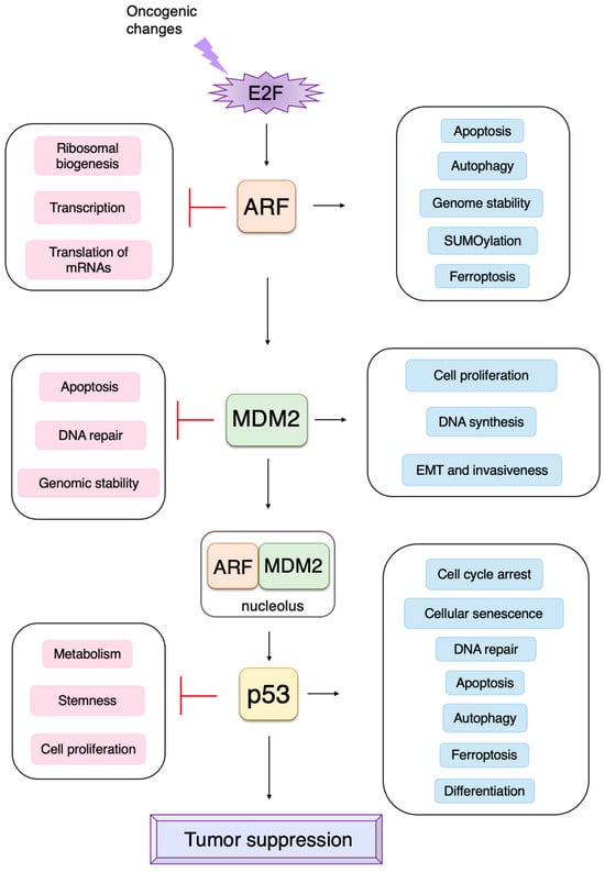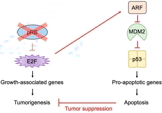 Cancer is a genetic disease caused by mutations, which activate proto-oncogenes and inactivate tumor suppressor genes, leading to unrestrained proliferation of cells. Tumor suppressor genes fulfill crucial roles in the suppression of tumorigenesis by counteracting activation of proto-oncogenes, thereby suppressing cell proliferation. Cells possess two major tumor suppressive pathways to suppress tumorigenesis []; one is the retinoblastoma (RB) pathway, and the other is the p53 pathway. The RB pathway restrains cell proliferation through inhibition of the E2 transcription factor (E2F), an activator of growth-related genes, to suppress tumorigenesis. In the resting state of normal cells, RB binds to and inactivates E2F. Growth stimulatory signals and growth suppressive signals converge on RB (the RB pathway), regulating E2F to modulate cell proliferation. Hence, in most cancers, loss of function of the RB pathway, caused by oncogenic changes, facilitates cell proliferation by activating E2F, thereby promoting tumorigenesis []. Conversely, upon such events, E2F, liberated from control by RB, activates the alternative reading frame (Arf) tumor suppressor gene, leading to activation of the tumor suppressor p53 to protect cells from tumorigenesis []. Expression of the Tp53 gene, which codes for p53, is generally constitutive, and expression of p53 is mainly regulated at the protein level. In unstressed cells, p53 is ubiquitinated by mouse double minute 2 (MDM2; in humans, HDM2) and degraded by the proteasome; thereby, the p53 protein level is kept low. ARF sequesters MDM2 to the nucleolus and stabilizes p53 to enhance its activity (the p53 pathway). P53 is a transcription factor and activates genes involved in the induction of cell cycle arrest, resulting in cellular senescence (irreversible cell cycle arrest). P53 also activates genes involved in apoptosis (programmed cell death), resulting in cancer cell death, depending on cellular circumstances. Both cellular senescence and apoptosis contribute to the suppression of tumorigenesis mediated by p53. Hence, in almost all cancers, the p53 pathway is also disabled so that cancer cells can survive []. As such, the main role of the RB pathway in the suppression of tumorigenesis is restraining E2F activity to avoid uncontrolled proliferation of cells. The main role of the p53 pathway is inducing cellular senescence or apoptosis upon dysfunction of the RB pathway. The main role of E2F is activation of the p53 pathway upon dysfunction of pRB by oncogenic changes. The roles of these two major tumor suppressive pathways, and those of E2F in linking the two, have been well established. However, recent studies have identified additional functions and regulatory mechanisms of each component of the pathways, such as p53-independent roles of ARF and transcription-independent roles of p53 in the suppression of tumorigenesis as well as the unique properties of E2F in connecting the RB pathway to the p53 pathway. Here, we will summarize the classical roles of the RB-E2F-p53 pathway in tumor suppression and introduce novel functions of each component, focusing on the crucial role of E2F in linking these two major tumor suppressive pathways.