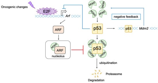 To ensure appropriate control and coordination of p53 activity under normal cell conditions and in response to a variety of cellular stresses, the activation of p53 triggers feedback mechanisms to negatively regulate its activity. The activation of p53 enhances the expression of its negative regulator MDM2 [] and suppresses the expression of its positive regulator ARF [], thereby fine-tuning its own activity (Figure 5).