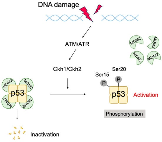Molecular mechanism of activation of p53 by DNA damage. Upon DNA damage, ATM/ATR and CHK1/CHK2 are activated, which phosphorylate p53 at Ser15 and Ser20, thereby blocking the interaction of MDM2 and stabilizing the p53 protein.