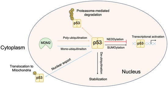 Expression of the Tp53 gene, which codes for p53, is relatively constitutive, and p53 expression is mainly regulated at the protein level. In unstressed cells, p53 is expressed at very low levels with a short half-life (minutes). This is because p53 is continuously ubiquitinated and degraded through the proteasome. The principal E3 ubiquitin ligase for p53 is the oncoprotein MDM2 []. MDM2 negatively regulates p53 in multiple ways, such as interfering with the transactivation of target genes by binding to p53 [,], the degradation of p53 via its intrinsic ubiquitin ligase activity [], and the translocation of p53 from the nucleus to the cytoplasm to facilitate proteasome-mediated degradation [,] (Figure 5).