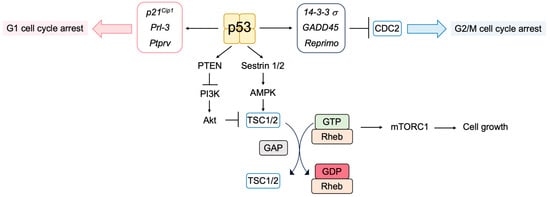 The mechanistic target of rapamycin (mTOR) protein kinase plays a crucial role in nutrient and growth factor signaling. For the activation of mTORC1, one of the two mTOR complexes (mTORC) that is sensitive to rapamycin, guanosine triphosphate (GTP)-bound Rheb is required (Figure 8). Tuberous sclerosis complex 1 (TSC1) and TSC2 form heterodimers and inactivate Rheb by stimulating conversion to the guanosine diphosphate (GDP)-bound form by GTPase-activating protein (GAP) activity. P53 suppresses the mTOR pathway by transcriptionally inducing the expression of Sestrin1 and Sestrin2, which activate the adenosine monophosphate (AMP)-responsive protein kinase (AMPK). AMPK phosphorylates TSC2 and stimulates its GAP activity, thereby suppressing Rheb [,]. Phosphatase and Tensin homolog deleted from chromosome 10 (PTEN) tumor suppressor is a negative regulator of phosphatidylinositol-3 kinase (PI3K)/AKT/protein kinase B (PKB)-mediated cell survival and growth-promoting signaling pathway. P53 transcriptionally induces the expression of PTEN, which is required for p53-mediated apoptosis in immortalized mouse embryonic fibroblasts [].