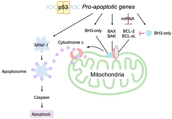 The induction of apoptosis by p53 is mainly mediated through the mitochondria [,]. The release of cytochrome c from the inter membranous space of the mitochondria into the cytosol triggers a cascade of apoptosis-inducing processes, where cytochrome c complexes with apoptotic peptidase activating factor 1 (APAF-1) to form the apoptosome, which activates caspase-9 to initiate the cascade (Figure 9). Thus, mitochondrial outer membrane permeability (MOMP) is the critical determinant of whether to induce apoptosis or not. The outer mitochondrial membrane is stabilized by anti-apoptotic B-cell lymphoma 2 (BCL-2) family members, such as BCL-2, B-cell lymphoma-extra large (BCL-xL), and myeloid cell leukemia 1 (MCL-1), and it is destabilized by pro-apoptotic BCL-2 family members, which are grouped into pore-forming proteins and BCL-2 homology domain 3 (BH3)-only proteins. Pore-forming proteins consist of BCL-2-associated X (BAX) and BCL-2 homologous antagonist/killer (BAK). BCL-2 homology domain 3 (BH3)-only proteins comprise BCL-2 agonist of cell death (BAD), BCL-2 interacting mediator of cell death (BIM), NOXA, and p53 up-regulated modulator of apoptosis (PUMA). BH3-only proteins bind to and activate BAX and BAK to form a pore complex that results in release of cytochrome c into the cytoplasm. Conversely, anti-apoptotic BCL-2 family members bind to BH3-only proteins and sequester them from BAX and BAK, thereby stabilizing the outer mitochondrial membrane. P53 transcriptionally induces the expression of many of the pro-apoptotic BCL-2 family members, such as BAX, NOXA, PUMA, and APAF-1 [,,,,,]. P53 also reduces the expression of anti-apoptotic BCL-2 family members, such as BCL-2, by increasing transcription of microRNAs (miRNAs) such as miR-15b, miR-16, miR-34a, and miR-1915 [,,,,,,,]. In addition, Amphiregulin (AREG), induced by p53, interacts with an RNA helicase DEAD-box helicase 5 (DDX5) and stimulates the generation of miR-15a to reduce the expression of anti-apoptotic protein BCL-2 []. Taken together, p53 plays a central role in the induction of apoptosis by promoting the release of cytochrome c from the mitochondria and the formation of the apoptosome (Figure 9).
