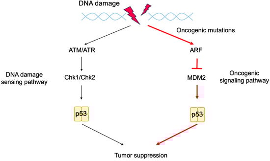 Since p53 plays a crucial role in maintaining genome stability, it has long been considered that the primary role of p53, as a tumor suppressor, is to prevent the generation of cells with mutations in proto-oncogenes and/or tumor suppressor genes. However, the elucidation of the ARF-MDM2-p53 pathway, with the Arf gene serving as a sensor of oncogenic stresses, raised the question as to which is more important for tumor suppression: DNA damage sensing (ATM/ATR-CHK1/CHK2-p53 pathway) or oncogenic stress responses (ARF-MDM2-p53 pathway). To address this question, a mouse model was established in which p53 function could be switched on and off in vivo by fusing p53 with estrogen receptor α, which, in the absence of a hormone, sequesters p53 in the cytoplasm until it is activated by the addition of 4-hydroxy-tamoxifen (4-OHT), an estrogen analogue, in feeding water. Using this model, the incidence of lymphoma induced by whole-body irradiation was examined by switching on p53 function at the time of irradiation or at a later time after the acute DNA damage response subsided. Switching on p53 function concurrently with irradiation had no effect on tumor incidence, whereas activating p53 at the later timepoint significantly suppressed tumorigenesis. Moreover, this effect was absolutely dependent on p19ARF []. In a similar experimental approach, both p53 alleles were somatically deleted in mice at various ages. Deletion of p53 at 3 months of age showed a longer tumor latency compared to deletion at 6 and 12 months of age. These results suggest that tissues accumulate oncogenic mutations with age, which are monitored by p53. In addition, p53 was deleted in combination with ionizing radiation (IR). The presence of p53 during IR treatment showed no effect on IR-induced tumor latency, supporting that the immediate DNA damage response does not contribute to tumor suppression []. In another model, p53 super mice, which carry an additional copy of the Tp53 gene, were generated. Wild-type and p53 super mice were treated with DNA-damaging agent 3-methyl cholanthrene, which generates mutations and facilitates tumorigenesis. p53 super mice showed greater resistance to the agent than wild-type, whereas the effect of additional p53 was lost in the absence of ARF []. Taken together, these observations indicate that oncogenic signaling is critical for triggering tumor suppression by p53, whereas the acute response of p53 to DNA damage has little effect, underscoring the crucial role of the Arf gene in tumor suppression by monitoring oncogenic changes and activating p53 (Figure 10).