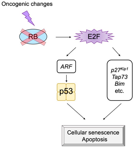 ARF can trigger cellular senescence or apoptosis by activating p53. In addition to the Arf gene, there are several tumor suppressor genes such as p27Kip1, Tap73, and Bim, which are activated by deregulated E2F activity but not by physiological E2F activity [,,]. The induction of p27Kip1 expression by deregulated E2F [] inhibits CDKs, thereby restraining cell cycle progression []. TAp73 is a p53 family member, which can activate p53 target genes independent of p53. The Tap73 gene is an E2F target [,] that is specifically activated by deregulated E2F and not by physiological E2F induced by growth stimulation []. In addition, there are nine novel targets (Bim, Rassf1, Ppp1r13b, Jmy, Moap1, Rbm38, Abtb1, Rbbp4, and Rbbp7) that are specifically activated by deregulated E2F []. Bcl-2 Interacting Mediator of cell death (BIM) is a member of the BH3-only family and destabilizes the mitochondrial outer membrane to release cytochrome c and trigger apoptosis. Thus, it is expected that deregulated E2F contributes to the induction of cell cycle arrest or apoptosis, not depending on p53, through alternate pathways mediated by p27Kip1, TAp73, BIM, and other products of the genes listed above, which are specifically induced by deregulated E2F1 (Figure 14).