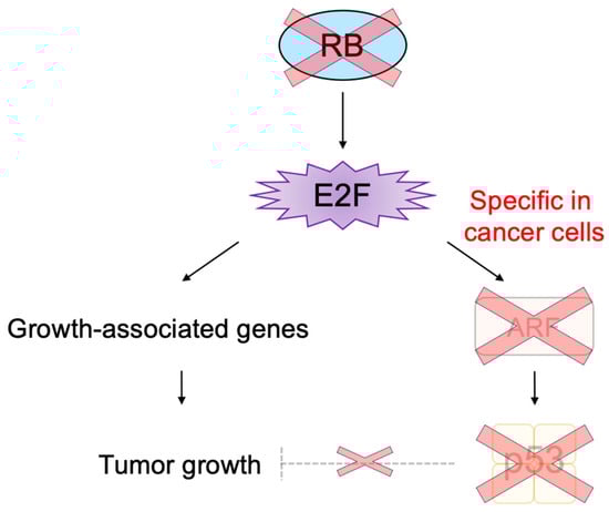 Deregulated E2F activity, which activates tumor suppressor genes, specifically exists in cancer cells. Upon dysfunction of the RB pathway, deregulated E2F1 activates the Arf gene to protect cells from tumorigenesis. However, the p53 pathway is also disabled in cancer cells, enabling cancer cells to survive, leaving deregulated E2F1 activity that specifically exists in cancer cells. Red crosses on RB, ARF and p53 indicate their dysfunction, and that on dashed line indicates p53 cannot suppress tumor growth.