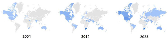 World maps representing the increasing number of countries (light blue) expressing interest in the ozone therapy according to the search in Google Trend of the term “ozone therapy” for the indicated years.