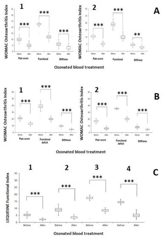 Figure 3 shows the effect of five runs of ozonized blood in knee OA-affected patients (Figure 3 panel A1: female; and Figure 3 panel A2: male) showing a type I Ahlback knee OA. In female patients, pain was reduced by five score units (from 10.45 ± 2.89 SD to 5.12 ± 1.49 SD, p < 0.0001), functional deficit by thirteen score units (from 22.60 ± 2.34 SD to 12.30 ± 2.39 SD, p < 0.0001) and stiffness by three score units (from 6.30 ± 2.18 SD to 2.85 ± 1.70 SD, p < 0.0001), i.e., ozonated blood roughly halved pain, functional deficit and stiffness (51.01%, 45.58% and 54.81%, respectively).