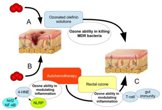 The ability of ozone to counteract the progression and exacerbation of infected wounds is based on three possible levels: (A) the direct chemical activity of ozonated formulations on the infected skin; (B) the immune regulation held by Nrf2 and 4-HNE, driving the M1/M2 skewing and promoting an anti-inflammatory mechanism, thus improving bacterial clearance; (C) (less investigated) the immune activity held by gut immunity.