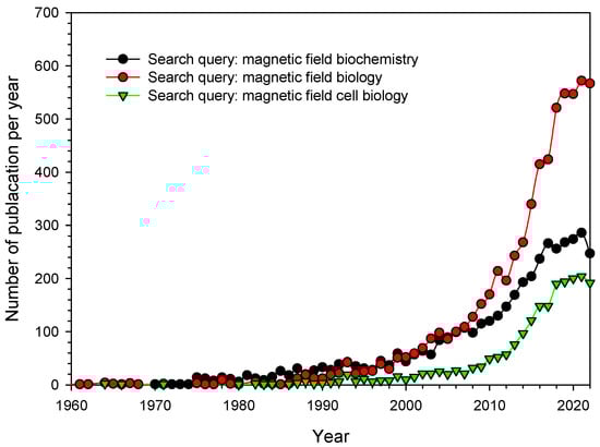 Dynamics of global publishing activity by keywords: magnetic field + biology, magnetic field + cell biology, magnetic field + biochemistry (according to https://pubmed.ncbi.nlm.nih.gov/, accessed on 2 October 2023).