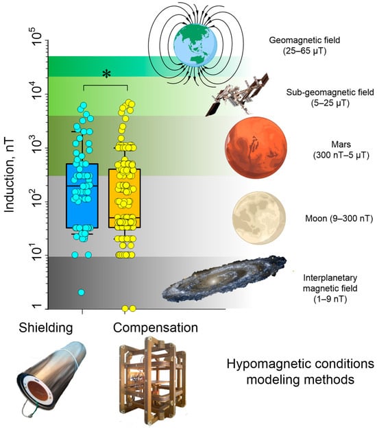 The value of magnetic field induction when modeling HMC (references in Table 1). Each point is the value of magnetic field induction indicated in the literature. The color indicates the method for simulating HMC: orange—compensation using Helmholtz coils, blue—shielding using soft magnetic materials. The induction ranges of the magnetic fields of the Earth and objects in space closest to the Earth are shown using shaded areas. *—p < 0.05, Mann–Whitney Rank Sum Test. A total number of analyzed experimental points is 350. The results are shown as medians (box centers) with percentiles 25% and 50% (box bottom and top) and percentiles 10% and 90% (bars).