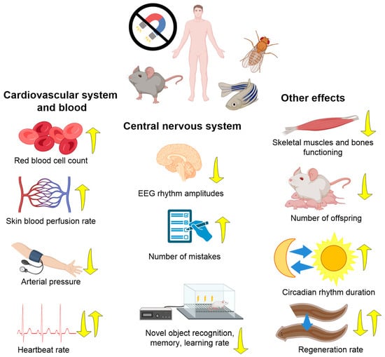 In humans, changes affect both the macrocirculatory system and microcirculation. For macrocirculation, a decrease in heart rate and diastolic pressure under the influence of HMC is detected []. For microcirculation, the opposite effect is found—an increase in the speed of blood flow in the capillaries []. An increase in capillary blood flow velocity may be the cause of a compensatory decrease in heart rate []. The effects of HMC can be explained by changes in the modulating influence of the parasympathetic division of the autonomic nervous system []. HMCs also change the characteristics and composition of the blood. In HMC rats, an increase in erythrocyte count and hematocrit, a decrease in erythrocyte volume, and a significant decrease in erythrocyte hemolysis were observed after 204 h of incubation []. The latter result may open up new prospects for the use of hypomagnetic fields for storing donor blood []. However, in another study, an increase in hemolysis of human blood was observed in HMC []. The differences in the data may be explained by different degrees of attenuation of the geomagnetic field: at ~200 nT, a reduction in hemolysis was observed, and at ~100 nT, hemolysis was enhanced [,]. On the part of the immune system, weakening of the PMA- and fMLF-induced “respiratory burst” of peritoneal neutrophils was found []. At the same time, the concentration of granulocytes in the blood increases []. HMCs also affect the functioning of the cardiovascular, hematopoietic, and immune systems. In particular, HMC caused an increase in heart rate in Danio renio fish embryos []. In mice, changes in the tissue and cellular structure of the myocardium occur [].