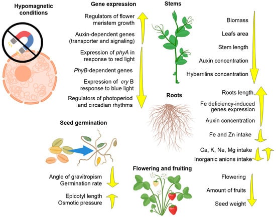 The main directions of the effects of hypomagnetic conditions on the morphology and physiology of plants. Arrows indicate the direction of the effect: decrease (down) or increase (up) in the parameter (references in Table 1).