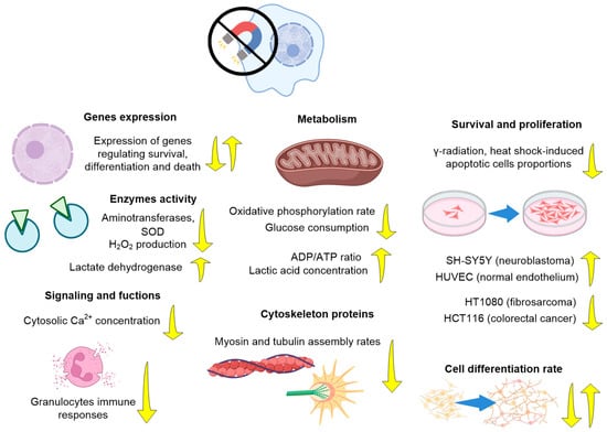 The effects of HMC on the cellular level are highly dependent on the cell types [] (Figure 5, Table 3). For a primary culture of neurons in the brain of newborn mice, HMCs increase the proliferation rate []. For SH-SY5Y neuroblastoma cells (field induction higher than in the previous study), a decrease in the proliferation rate and an extension of the S phase of the cell cycle were found []. The effects of HMC depend in a complex way on the residual magnetic field induction []. Using the SH-SY5Y line as an example, it was shown that during HMC, there was expression of over 2400 genes involved in the regulation of cell survival and death, with 90% of genes experiencing a decrease in expression, and only 10% an increase [].