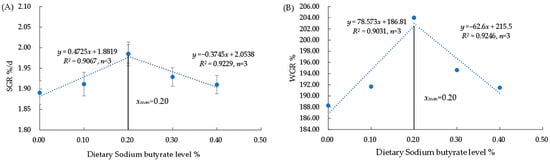 The optimal amount of NaB to add varies by species and has different effects on its growth performance. Elmazni et al. found that 0.05% NaB significantly improved the body weight of male New Zealand rabbits []. Diets with 1.00% and 2.00% NaB significantly improved the survival and weight gain of juvenile Chinese mitten crabs (Eriocheir sinensis) compared to those in the 0% NaB group []. The inclusion of 0.117% NaB in diets for Arapaima gigas juveniles improves growth parameters []. The equation for the relationship between the concentration of NaB added (x) and WGR (y) was obtained by fitting a linear, quadratic, and cubic model: y = 78.573 x + 186.81 (R2 = 0.9031), y = −248.56 x2 + 108.77 x + 187.18 (R2 = 0.6578), y = −227.07 x3 − 112.32 x2 + 89.245 x + 187.46 (R2 = 0.6629). The equation for the relationship between the concentration of NaB added (x) and SGR (y) was obtained by fitting a linear, quadratic, and cubic model: y = 0.4725 x + 1.8819 (R2 = 0.9067), y = −1.93 x2 + 0.7674 x + 1.8815 (R2 = 0.6629), y = −1.25 x3 − 0.7436 x2 + 0.5464 x + 1.8856 (R2 = 0.6652). Among them, the R2 value of the linear equation was the highest. However, this study used the linear regression method and the SGR and WGR as evaluation indices to calculate that the NaB requirements for juvenile triploid O. mykiss were 0.20% (Figure 1).