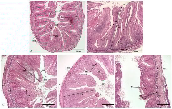 Effects of dietary sodium butyrate level on intestinal morphology of triploid O. mykiss. Details of the distal intestine section from fish in the G1 (A), G2 (B), G3 (C), G4 (D), and G5 (E) groups. VH: villi height; VW: villus width; MT: muscle layer thickness; SML: submucous layer; LP: lamina propria; GC: goblet cell (green arrows); MV: microvilli (arrowheads); N: nucleus; EGC: eosinophilic granular cell (red arrow). Scale bar: 200 μm.