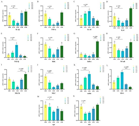 Effects of NaB on the expression of IL-1β (A), TNF-α (B), IL-10 (C), IL-8 (D), TGF-β(E), IKK (F), IκB-α (G), NF-κB (H), MLCK (I), MLC (J), ocldn (K), ZO-1 (L), cgn (M) and tric (N) in intestinal mucosal barrier of juvenile triploid O. mykiss. abc different superscript letters are significantly different (p < 0.05). All error bars represent S.E.; * p < 0.05, ** p < 0.01 and *** p < 0.001.