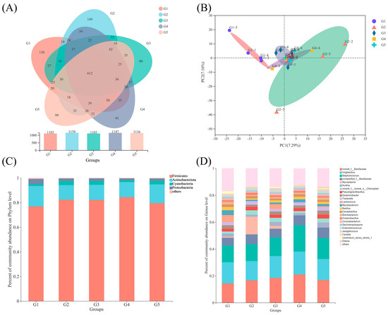 The Illumina MiSeq PE300 reading system generated an average of 40,862 sequences per sample from the 30 sequenced samples, totaling 530,999,267 effective sequences after deleting low-quality reads and chimeras. The sequences ranged in length from 212 to 516 bp, with an average length of 424 bp. The percentage of good coverage for each group exceeded 99.9%, demonstrating the accuracy and reliability of the diverse results. The rarefaction curves reached a plateau, indicating that the sequencing depth was sufficient to represent the diversity of the microbial species. The similarities and overlaps of OTUs (not defined) in the various groups were evaluated using a Venn diagram. The five groups shared 612 OTUs, and each group had a unique number of OTUs: 130 (G1), 149 (G2), 90 (G3), 93 (G4), and 99 (G5) (Figure 4A).