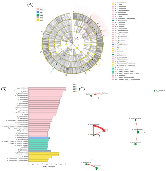 We conducted LEfSe analysis (Figure 5A) on the five groups and identified several bacterial genera as biomarkers of group difference: Bacillus, Enterobacter, Legionella, Escherichia-Shigella, Delftia, Sphingomonas, Lactobacillus, Pseudomonas, Brevundimonas, Tumebacillus, and others. Proteobacteria were the phylum-level biomarkers in G1, while Rhabdanaerobium was the genus-level biomarker in G2. Hydrogenophaga, nor-ank-f-norank-o-norank-c-KD4-96, and Erysipelothrix were the genus-level biomarkers in G3. Nocardioides were the genus-level biomarkers in G4, and Atopostipes and Bosea were the genus-level biomarkers in G5 (Figure 5B).