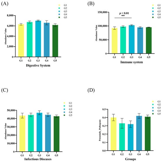 Predictive metagenomic analysis of O. mykiss fecal microbiota functional profiling. Bacterial gene functions were predicted from the 16S rRNA gene-based microbial compositions using the PICRUSt2 algorithm and inferences from KEGG databases. Abundance values of the digestive system (A), immune system (B), and infectious diseases (C) in the gut microbiota of O. mykiss. Relative abundance values of potential pathogenicity in the gut microbiota of O. mykiss (D). All error bars represent S.E.; ** p < 0.01).