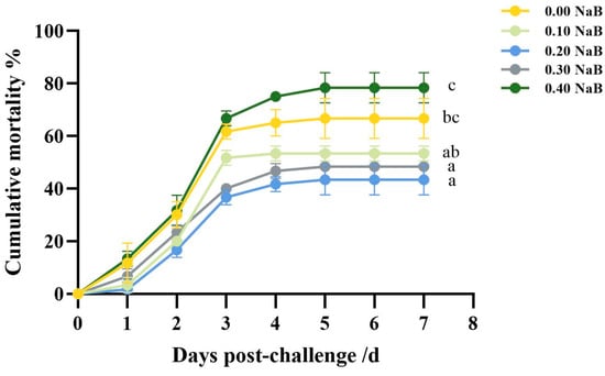 Effect of NaB supplementation on survival against bacterial infection. Different superscript letters indicate significant difference (p < 0.05).