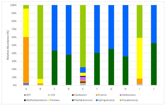 A total of nine genera with abundance greater than 1% of total reads were identified, and five of these genera showed abundance higher than 5%, namely Sphingomonas (in seven parcels), Phyllobacterium (in six parcels), Pantoea (in three parcels), Pseudomonas (in three parcels) and Erwinia (in two parcels), all of which are within the Proteobacteria phylum. As it can be observed in the histograms (Figure 1), there are significant differences among samples obtained from different parcels. In six of the analyzed plots, Sphingomonas and Phillobacterium are the dominant families; whereas in the other four, a greater abundance of Pseudomonas and Erwinia is observed. Erwinia billingiae is present in all parcels but significatively in parcel A from the Monção and Melgaço sub-region, accounting for 55.8% of all read counts. Some Erwinia species—such as Erwinia amylovora, the causative agent of fire blight, and E. pyrifoliae—are described as pathogens, but Erwinia billingiae is usually considered to be epiphytic [26,27]. Pseudomonas lutea is also present in high amounts but in parcel I from the Dão region.