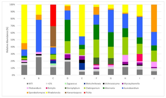 Relative abundances (%) of dominant sequences (>1%) assigned to genus level that were identified in samples based on partial sequence analysis of the Internal Transcribed Spacer 2 regions of the rRNA gene. WTI refers to the percentage of sequences without taxonomic attribution to the specified taxonomic level. A–J refers to the origin of the sequenced sample, as described in Table 1.