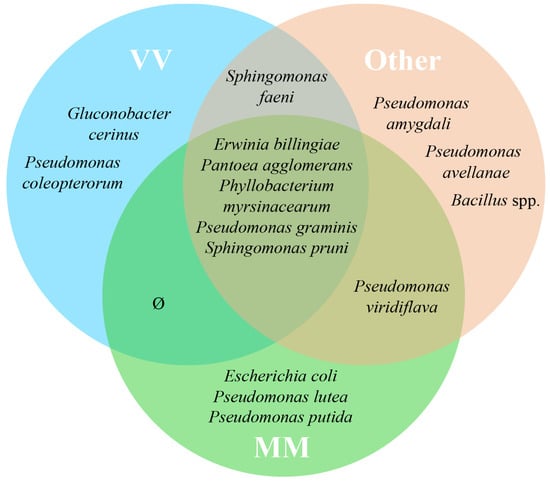 Venn diagram representing shared taxa of bacteria found on grape surface from ten Portuguese vineyard parcels from different regions/sub-regions, Monção and Melgaço (green area), Vinho Verde region (blue area) and Other (red area). Only taxa that are common to 100% of the parcels from a specific group (MM, VV or Other) are represented.
