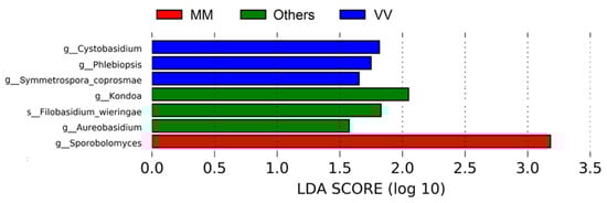 A LEfSe analysis (Figure 5) on the data revealed seven divergent taxa between the three groups of parcels mentioned above. The most significant feature is related to the anamorphic basidiomycetous yeast Sporobolomyces, specifically in MM plots when compared to the rest, but without known enological relevance. This yeast is commonly present in many vineyards in different parts of the world [5,41].