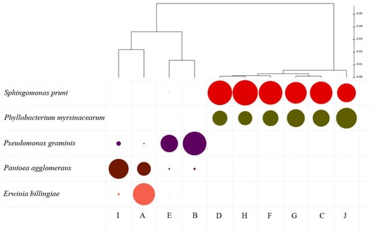Clustering dendrogram considering the most dominant bacterial groups present in the different plots (A–J), and size of colored circles reflecting relative abundance of each taxon.